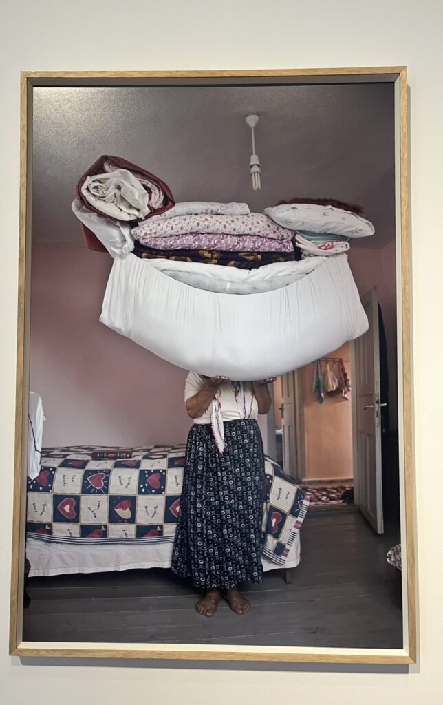 Odunpazarı Modern Müze’de çektiğim kapak görselinde yer alan bu fotoğrafı ilk gördüğümde saatlerce bakakaldım. Sadece bir kadını değil, bir sistemin suskun çığlığını gördüm. Kadının yüzü görünmüyor. Çünkü yüzü, bir yorgan yığınıyla kaplanmış. Başının yerinde yük var. Kadın emeği; ev işi, nevresim, beklenti, görev ve sessizlik ile tanımlanmış.
