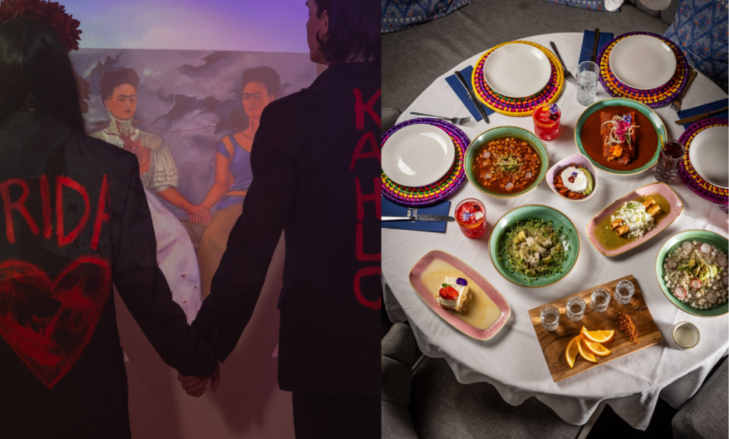 Serginin bir diğer dikkat çekici yönü ise gastronomi ile sanat arasındaki ilişkiyi vurgulaması. Tüm deneyim, Frida Kahlo ve Diego Rivera’nin 1929’daki düğünlerinden esinlenilmiş bir beş aşamalı Meksika tadım menüsü ile devam ediyor. Bu menüde flautas, pozole, pipián ve geleneksel tatlı tres leches gibi yemekler yer alıyor; her yemekte Mezcal veya tequila eşlik ediyor. Böylece sergi, ziyaretçinin hem kültürel hem de duyusal bir bağ kurmasını sağlayan çok katmanlı bir anlatı oluşturuyor.